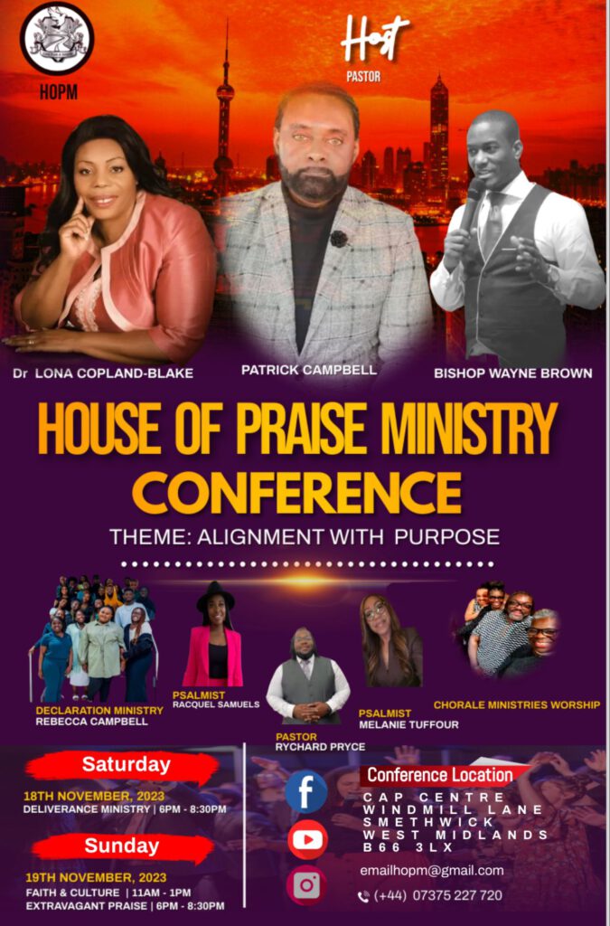 Upcoming Events find out whats going on at the house of praise ministires Alignment with purpose Deliverance Ministry: 18th November- 6 pm- 8:30 pm Faith & Culture: 19th November 2023 - 11 am- 1 pm Extravagant Praise- 6 pm-8:30 pm Address: CAP Centre Windmill Lane Smethwick Midlands B66 3lx Declaration uk Spirit Night: 25th November 2023 5 pm Warwick University. Coventry CV4 7AL Doors Open